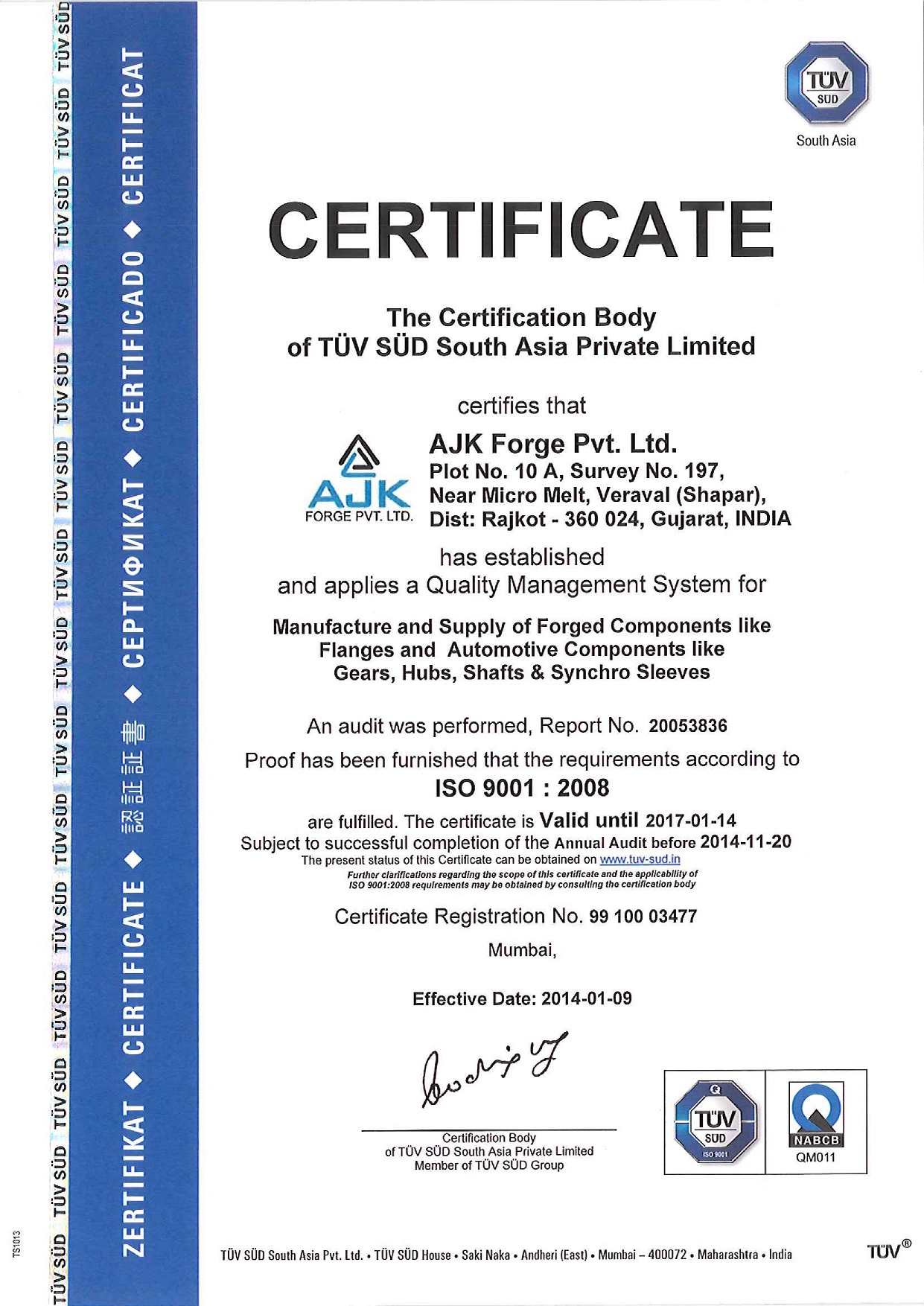 AJK FORGE PVT. LTD. is one of the leading manufacturers of closed die steel forgings & forged Rolled rings situated in Industrial Zone of Veraval (Shapar) 15 kms from Rajkot city in Gujarat state. We have got Drop forging as well as ring rolling Facility available at our plants. From its beginnings in 2006, AJK FORGE PVT. LTD. has always produced top-quality products at affordable prices. We delivers more standard features, high-tech innovations and rock-solid engineering to its valued customer at better prices. Our company is ISO- 9001-2008 Certified by TUV SUD South Asia Pvt Ltd.